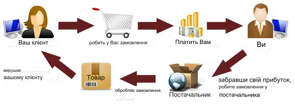 Дропшиппінг – це схема продажу товару чи послуги, коли Вы заробляєте гроші, не вкладуючи свої кошти в закупку товару й не займаєтесь його відправкою. Наприклад на схемі нижче.